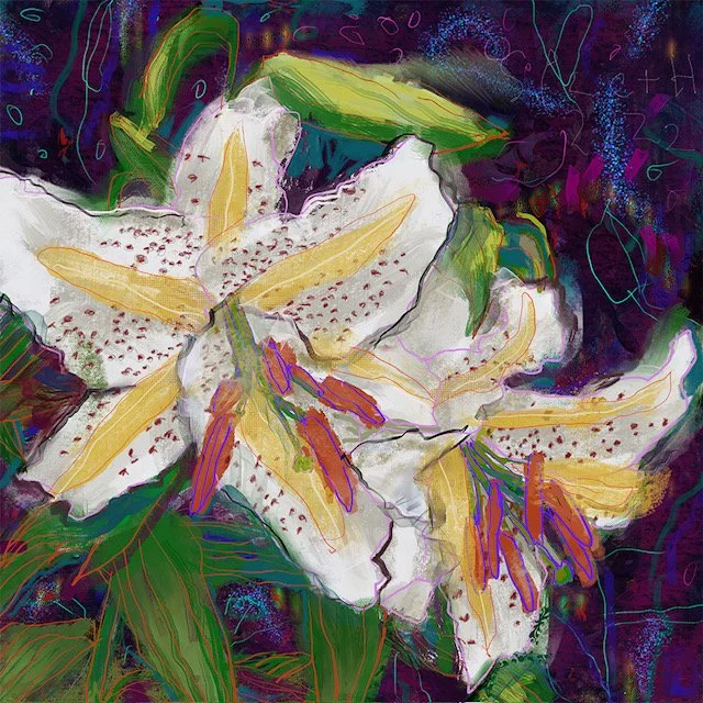 Tom uses an iPad and drawing applications to create works from travels, family reflections, the flowers in his surroundings and his imagination. The images are printed onto aluminum to give them a physical form and in keeping with the contemporary digital environment.